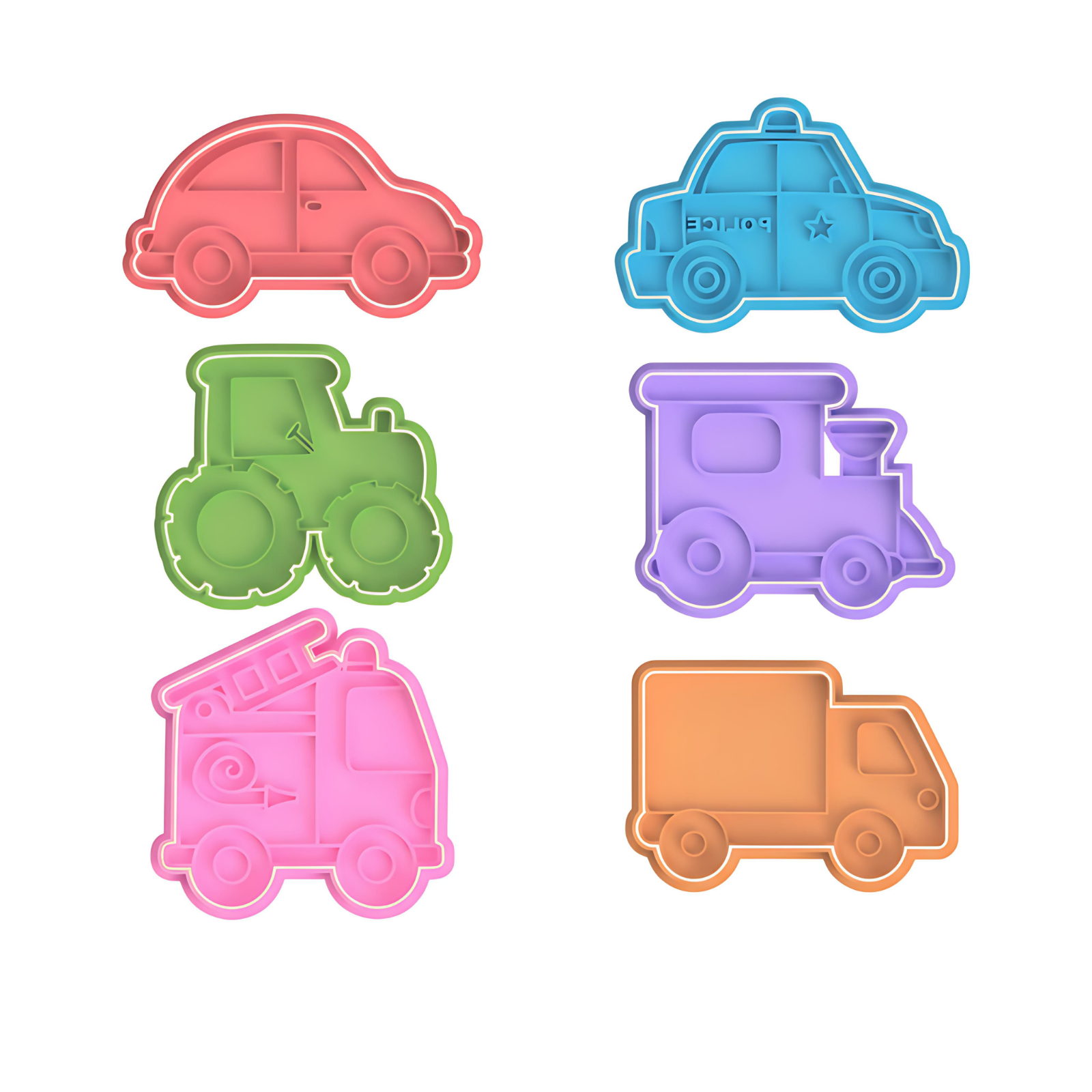 Μικρό σετ cookie cutters με αγαπημένα οχήματα – αυτοκίνητο, περιπολικό, τρακτέρ, τρένο, πυροσβεστικό και φορτηγό. Ιδανικό για παιδικά πάρτι, δραστηριότητες και δημιουργίες με μπισκότα ή ζαχαρόπαστα.