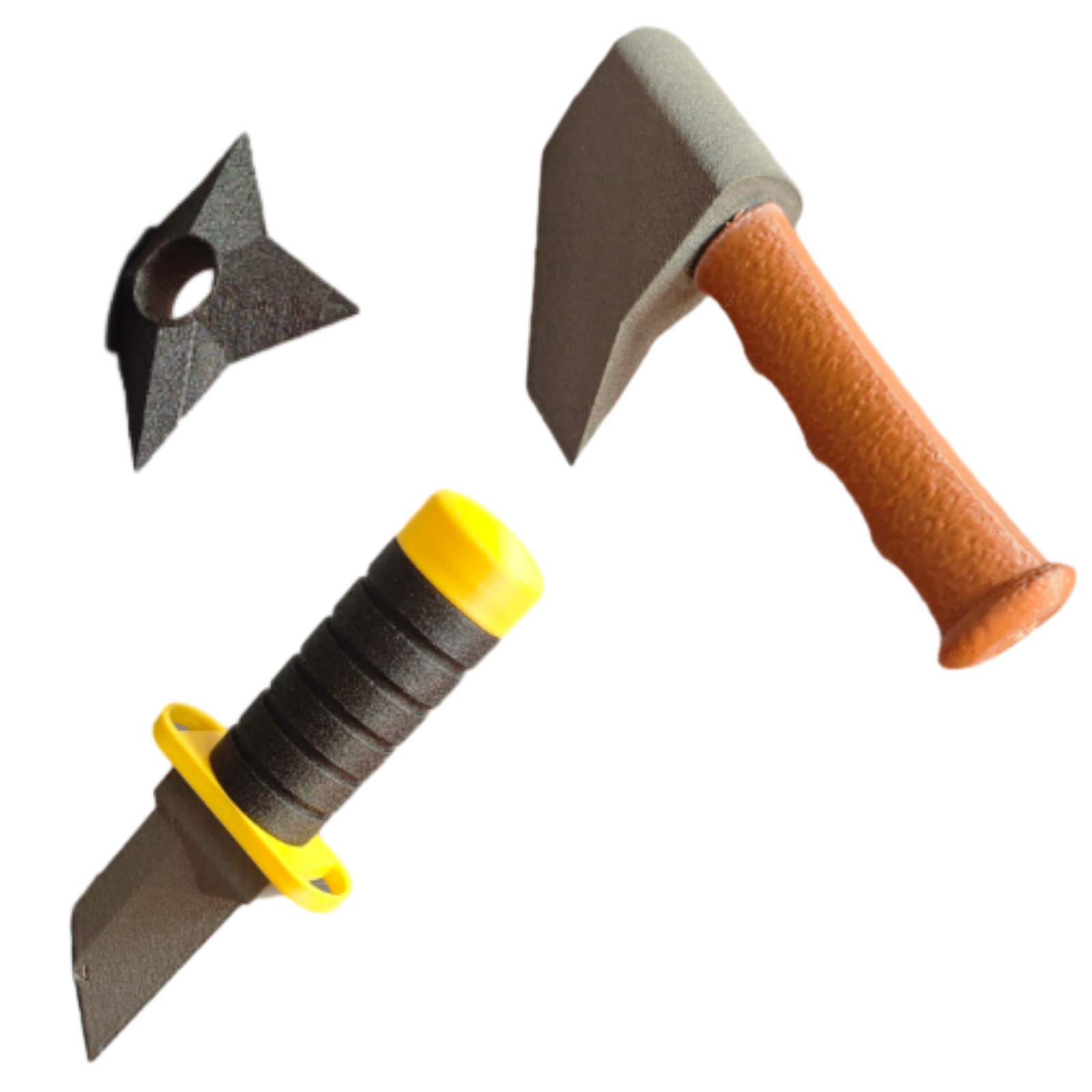 🥷 Ρεαλιστικά αντίγραφα όπλων σε μίνι μέγεθος — διαθέσιμα σε 3 σχέδια: shuriken ninja star, τσεκούρι και μαχαίρι.