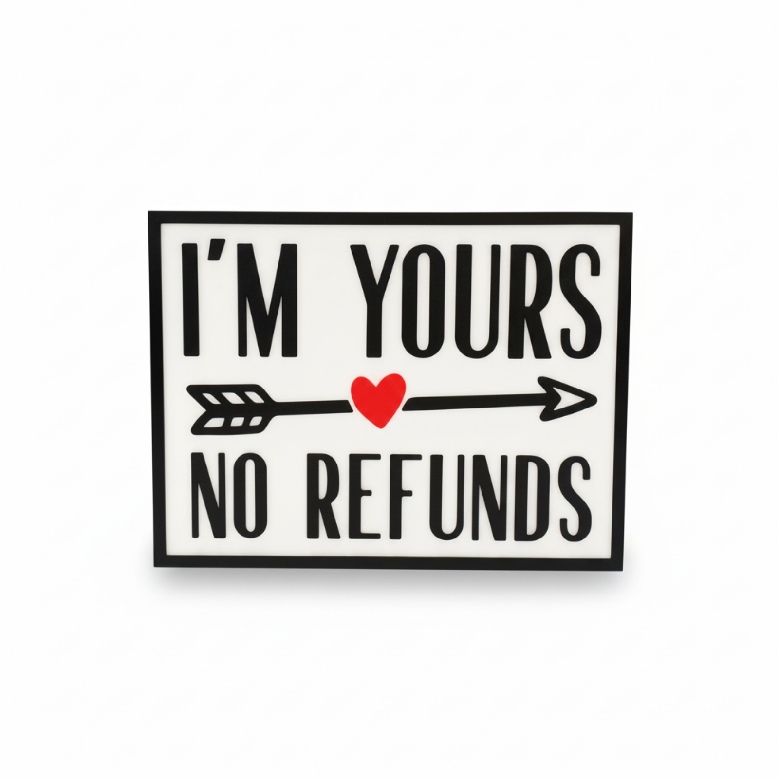 😂❤️ Χιουμοριστική πινακίδα αγάπης με την αστεία φράση “I’m Yours – No Refunds” και βέλος με καρδούλα.