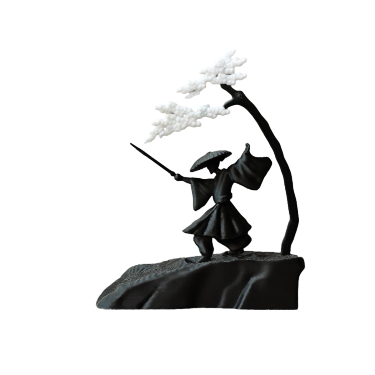 ⚔️ Εντυπωσιακό γλυπτό διακοσμητικό με σαμουράι σε δράση κάτω από ανθισμένο δέντρο σε βραχώδη βάση.